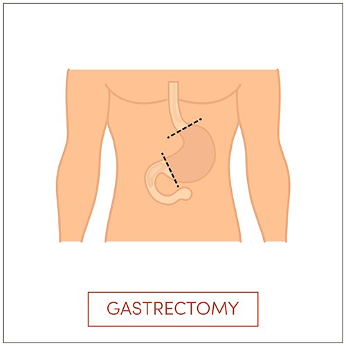 Gastric cancers which are located in the distal part of the stomach will be eligible for a subtotal gastrectomy . This involves removal of the later 2/3 of the stomach. It is important to have a margin of 5 cm from the tumor . The remaining part of the stomach is joined with a loop of small intestine to restore the continuity.